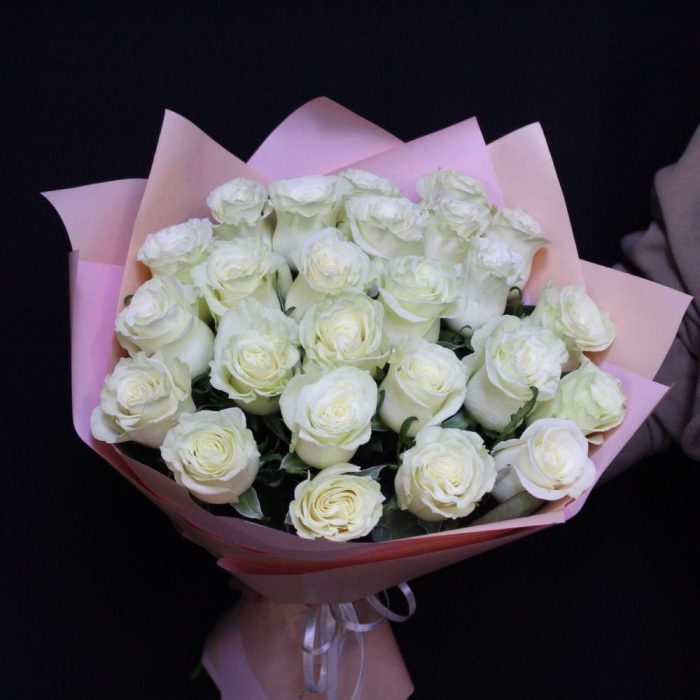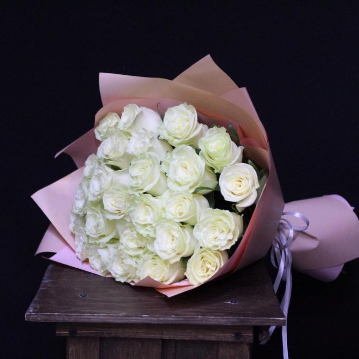 Роза Мондиаль – 25 шт.Пленка дизайнерская – 3 шт.Лента атласная – 1 шт.