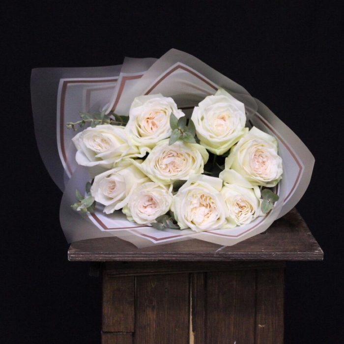 Эвкалипт – 2 шт.Пленка дизайнерская – 2 шт.роза пионовидная white o’hara – 9 шт.