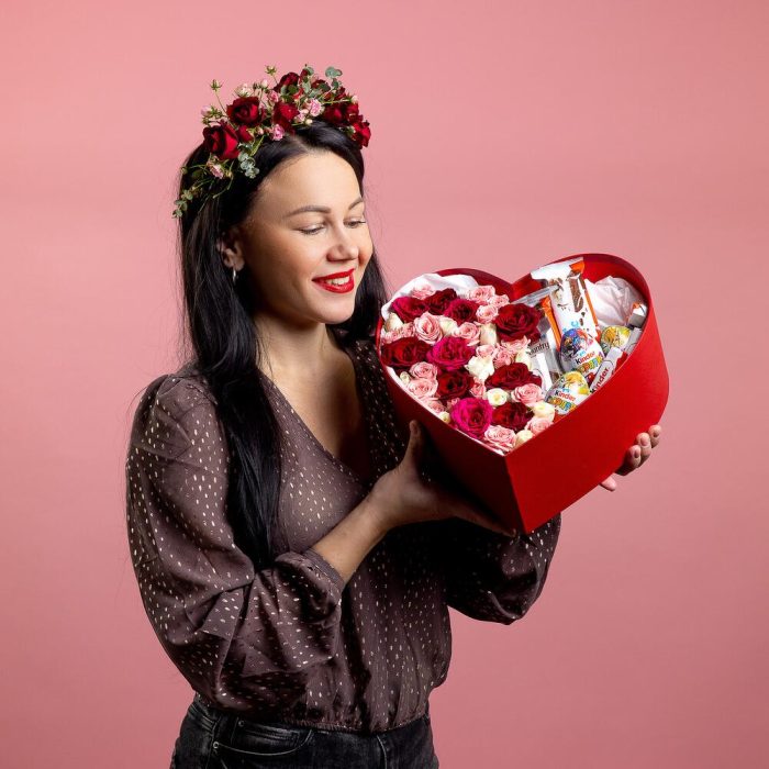 Бумага тишью – 2 шт.кирпич oasis классик – 1 шт.роза кустовая белый – 2 шт.роза кустовая красный – 1 шт.роза кустовая малиновый – 2 шт.роза кустовая розовый – 2 шт.киндер яйцо сюрприз – 3 шт.Киндер Делис – 2 шт.Киндер кантри – 1 шт.киндер шоколадные палочки – 5 шт.