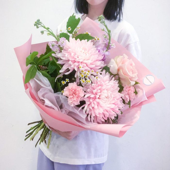 Маттиола – 2 шт.Лента атласная – 1 шт.Тишью – 1 шт.Диантус – 2 шт.Матрикария – 3 шт.Фисташка – 3 шт.Хризантема Антонов – 2 шт.Роза французская – 1 шт.Аквапак – 1 шт.Корейская пленка – 3 шт.ветки декоративные – 2 шт.