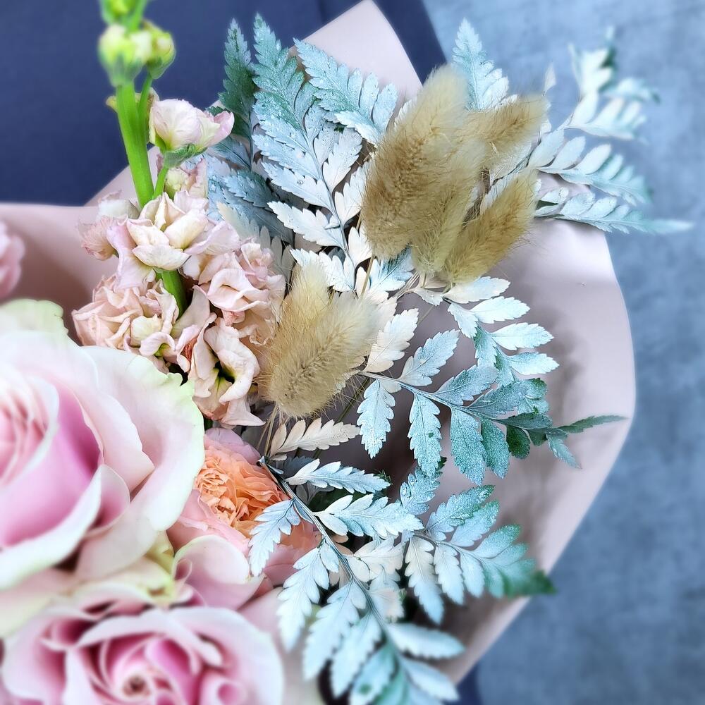 Маттиола – 1 шт.Папоротник – 1 шт.Хлопок – 1 шт.Роза Эквадор – 3 шт.Гвоздика – 3 шт.роза джульетта кустовая – 1 шт.