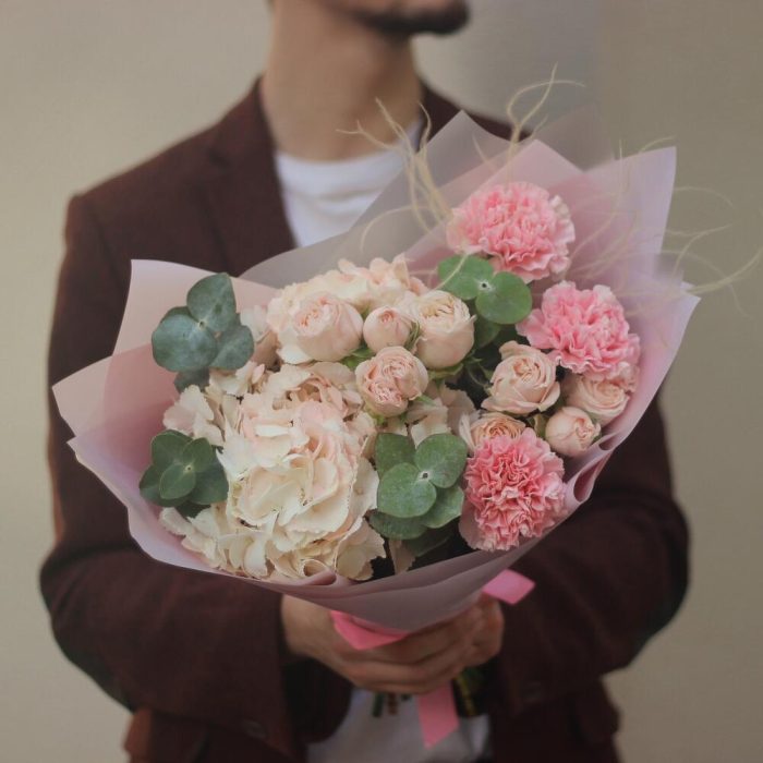Нежный авторский букет с гортензией, пионовидными кустовыми розами Бомбастик и гвоздиками