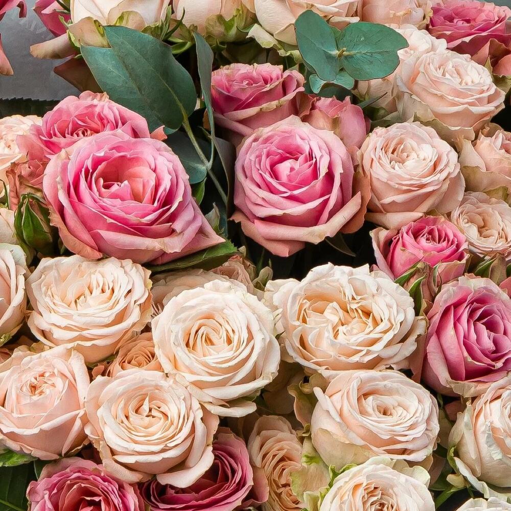 роза кустовая пионовидная bombastic – 8 шт.роза кустовая пионовидная pink irishka – 9 шт.Эвкалипт – 2 шт.Подарочная упаковка – 1 шт.Средство для продления жизни цветов – 1 шт.