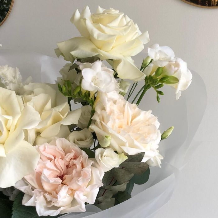 Дельфиниум – 1 шт.ферзия – 2 шт.Роза пионовидная – 2 шт.Роза сортовая – 3 шт.Лизиантус – 1 шт.Эвкалипт – 1 шт.Упаковка дизайнерская – 1 шт.