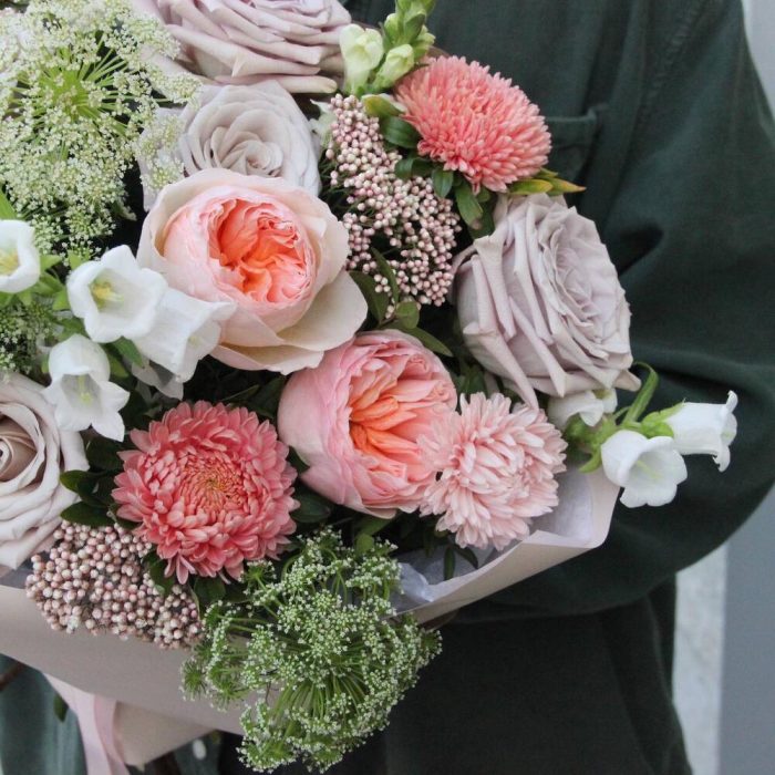 Авторский букет с английскими розами, зонтиками, колокольчиками, астрами и озотамнусом.Стильное цветочное решение для любого случая.
