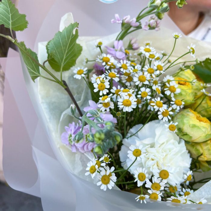 Маттиола – 2 шт.Лента атласная – 1 шт.Тишью – 1 шт.Роза кустовая пионовидная – 1 шт.Ветки березы – 3 шт.Матрикария (Ромашка Камила) – 4 шт.Черничник (ветки) – 3 шт.Корейская пленка – 4 шт.аквапак с водой – 1 шт.