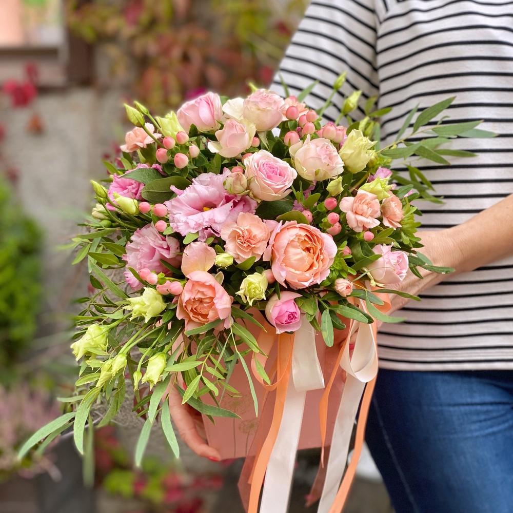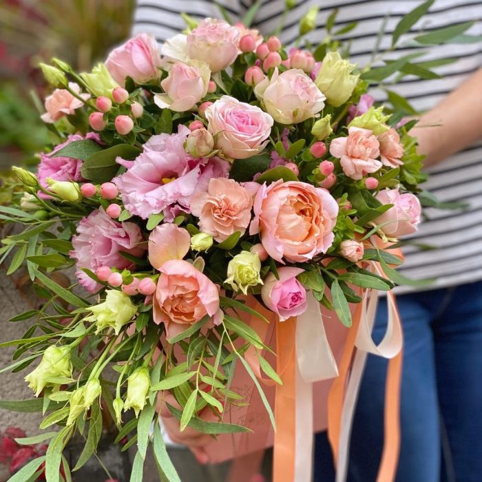 Гвоздики, Лизиантусы, Розы, Тюльпаны