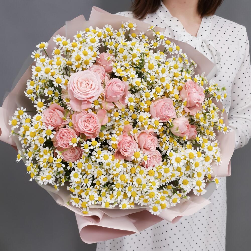 Роза кустовая Бомбастик – 4 шт.Упаковка – 1 шт.Ромашка кустовая – 19 шт.Аквапак – 1 шт.питательная смесь для срезанных цветов – 2 шт.