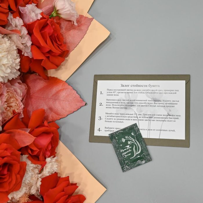 - Сроки возврата: Претензии по качеству букета принимаются в течение 24 часов с момента его получения.