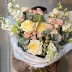 Роскошный светлый букет с пионовидной розой, матрикарией, вибурнумом и лизиантусом. Профессиональные флористы соберут для вас уникальный, стильный букет или композицию. Добавят к цветам открытку, инструкцию по уходу за цветами, chrysal. Бережно упакуют цветы в красивую, … Показать ещётранспортировочную упаковку. Курьеры быстро и бережно доставят заказ адресату. Также с радостью подберём для вас красивые свечи и предметы интерьера, которые прекрасно подойдут для подарка.