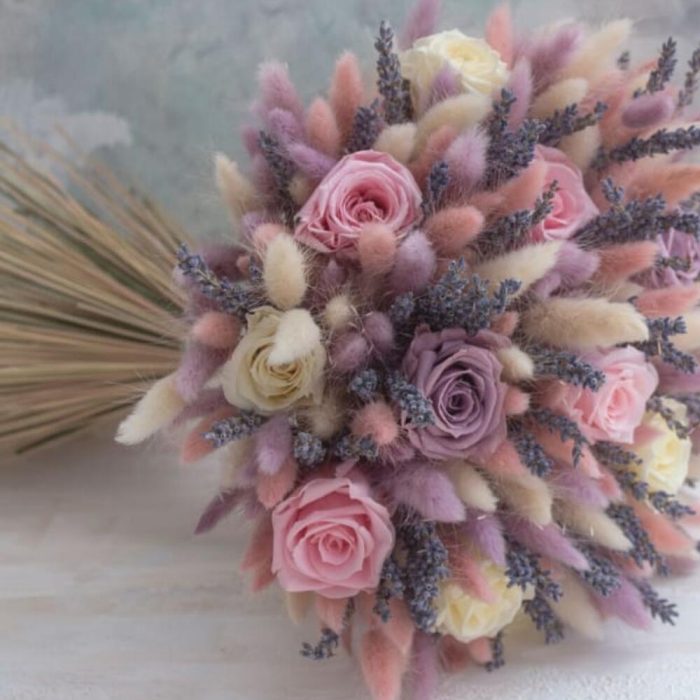 Роза – 9 шт.Лагурус (сухоцвет) – 95 шт.Лаванда (сухоцвет) – 55 шт.Лента атласная – 1 шт.