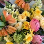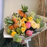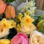Авторский букет с рябчиками, ранункулюсами, нарциссами, калиной, кустовыми пионовидными розами и львиным зевом .