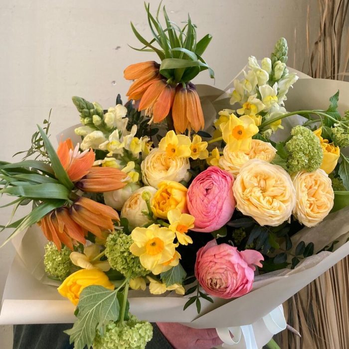 Авторский букет с рябчиками, ранункулюсами, нарциссами, калиной, кустовыми пионовидными розами и львиным зевом .
