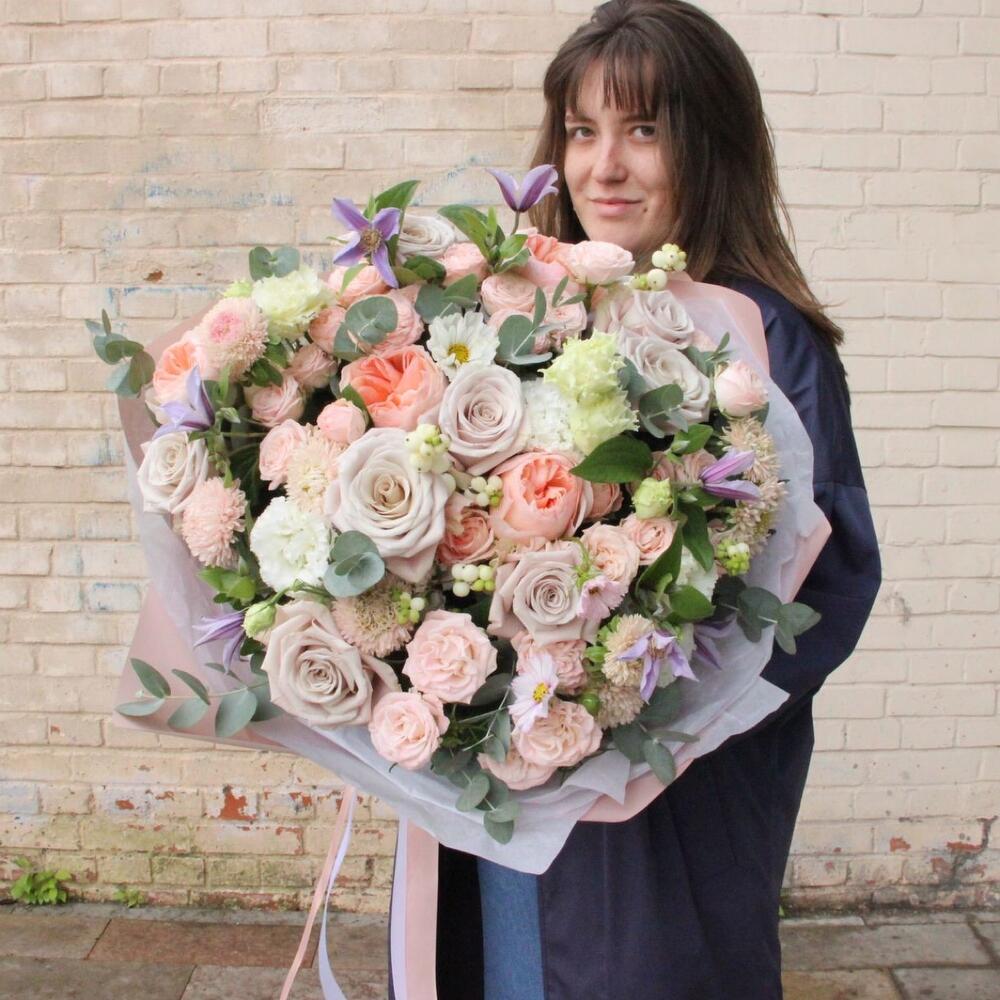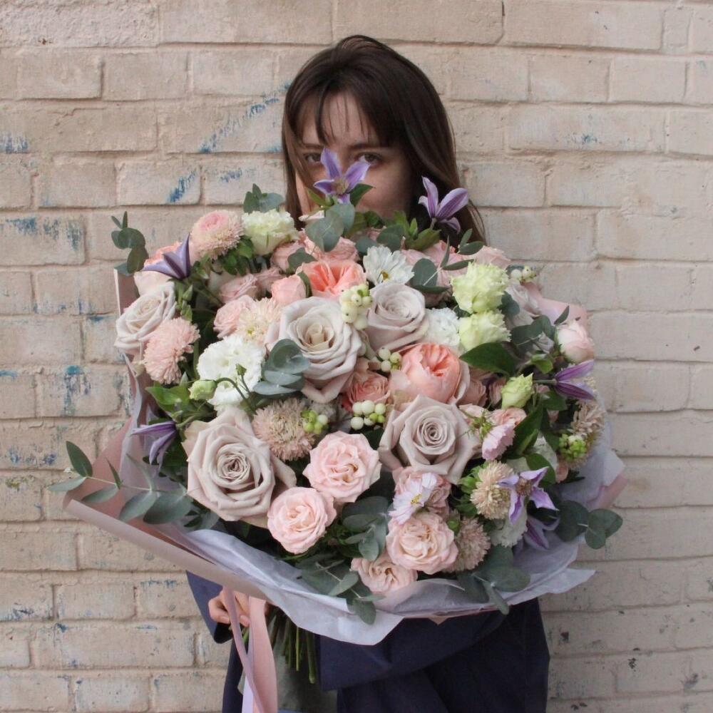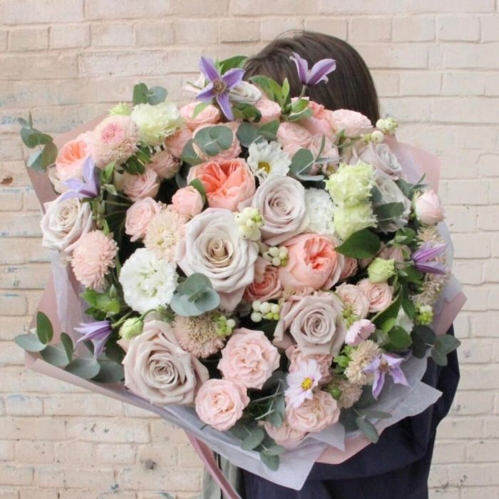 Садовый букет с пионовидными розами, эустомой, клематисом и эвкалиптом.Букет приедет в подарочной коробке, с рекомендациями по уходу за цветами.При необходимости, если букет с нежными цветами или ему предстоит весомое время в дороге – то цветы мы отравляем на воде, останется лишь аккуратно снять кулёчек с водой и поставить букет в подходящую вазу.К каждому букету мы подписываем открытку с вашим посланием – эта услуга, так же в подарок.