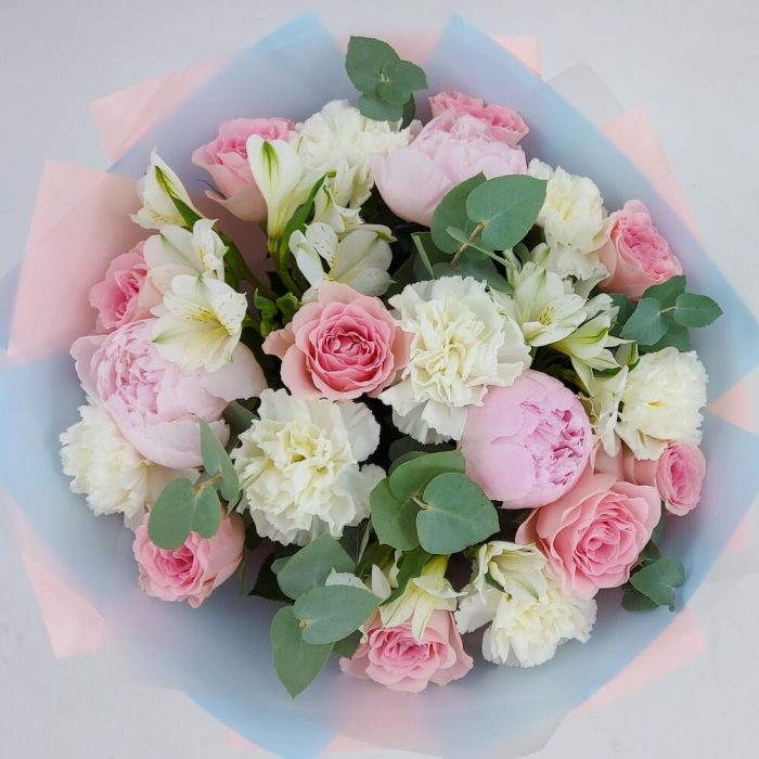 Альстромерия – 3 шт.Пион – 3 шт.Эвкалипт – 7 шт.Роза одноголовая – 9 шт.Упаковка дизайнерская – 1 шт.Пистация – 3 шт.гвоздика сортовая (диантус) – 7 шт.
