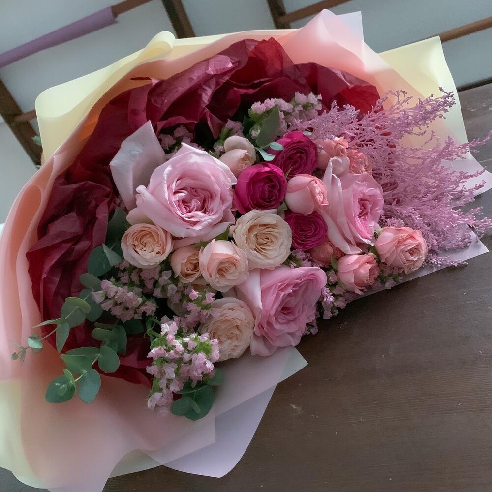 pink o’hara роза – 3 шт.Статица – 2 шт.Бомбастик роза – 1 шт.Роза кустовая – 2 шт.Солидаго – 1 шт.Эвкалипт – 3 шт.Упаковка дизайнерская – 1 шт.