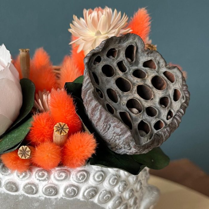 пионовидная роза стабилизированная – 1 шт.лотос сухоцвет – 1 шт.Лагурус (сухоцвет) – 30 шт.гелихризум (сухоцвет) – 5 шт.Ротанговые шарики – 1 шт.мак сухоцвет – 8 шт.Эвкалипт стабилизированный – 1 шт.