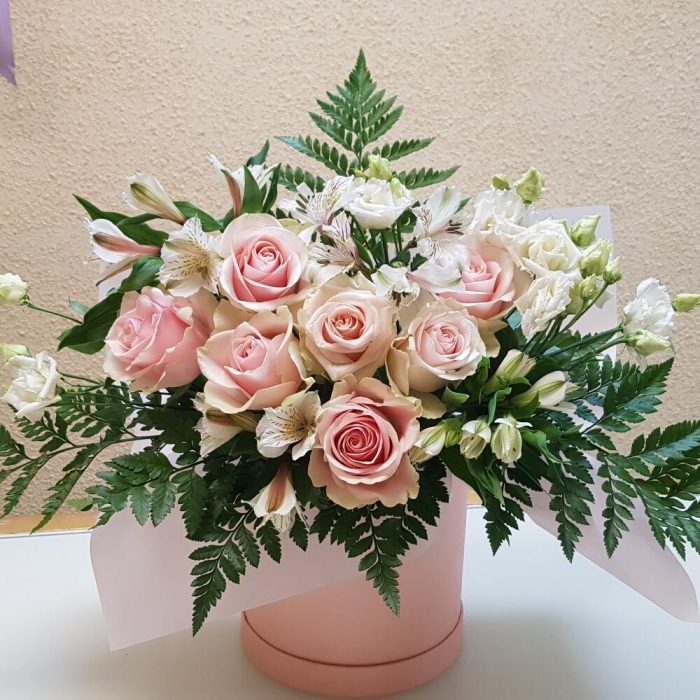 Роза Эквадор – 7 шт.Альстромерия – 4 шт.Листья папоротника – 3 шт.Коробка шляпная – 1 шт.бумага дизайнерская – 1 шт.