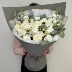Гортензия – 1 шт.Роза Эквадор – 5 шт.Лизиантус – 2 шт.Маттиола – 4 шт.Озотамнус – 2 шт.Диантус – 5 шт.Сантини – 2 шт.Эвкалипт – 2 шт.Упаковка дизайнерская – 4 шт.