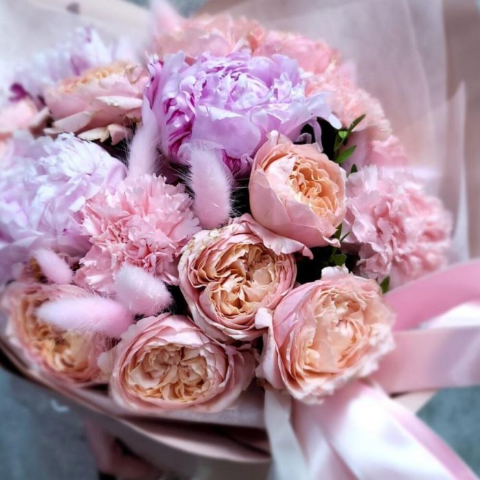 Пион – 3 шт.Гвоздика – 3 шт.Лента атласная – 3 шт.Фисташка – 2 шт.Лагурус – 11 шт.Пионовидная роза кустовая – 4 шт.