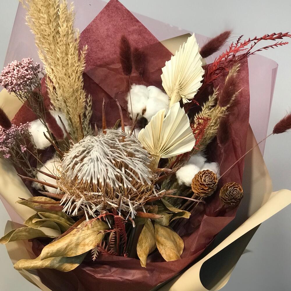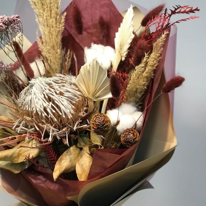 Хлопок – 5 шт.Протея – 1 шт.Пальма – 2 шт.Озотамнус – 2 шт.Бруния – 1 шт.кортадерия – 2 шт.лагурус пучок – 1 шт.гривеллия крашенная – 2 шт.Упаковка дизайнерская – 1 шт.