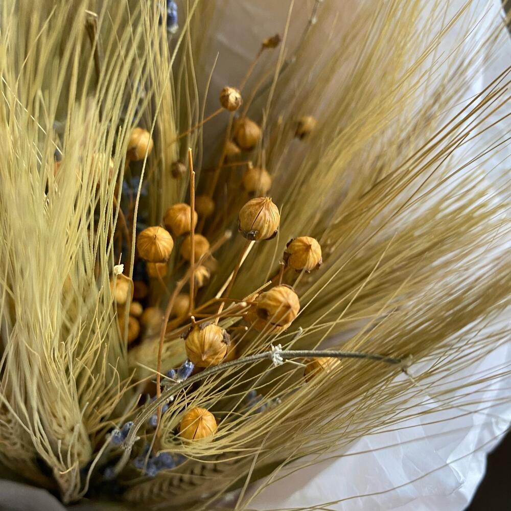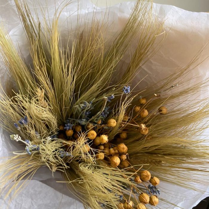 Лаванда (сухоцвет) – 3 шт.Пшеница пучок – 1 шт.Лен натуральный – 2 шт.Оформление – 1 шт.