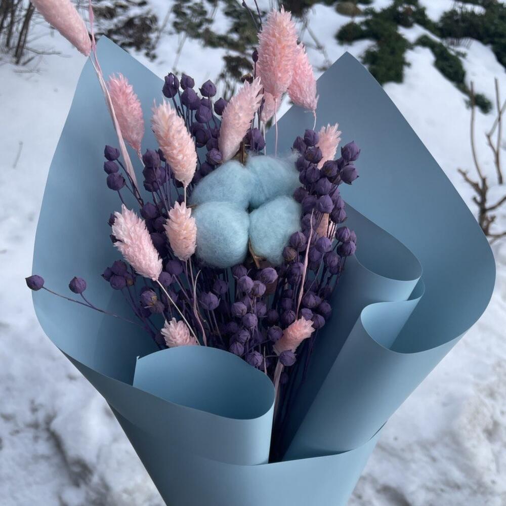 Хлопок натуральный – 1 шт.лëн сухоцвет – 25 шт.Фаларис – 12 шт.Упаковка дизайнерская – 3 шт.Лента атласная – 1 шт.