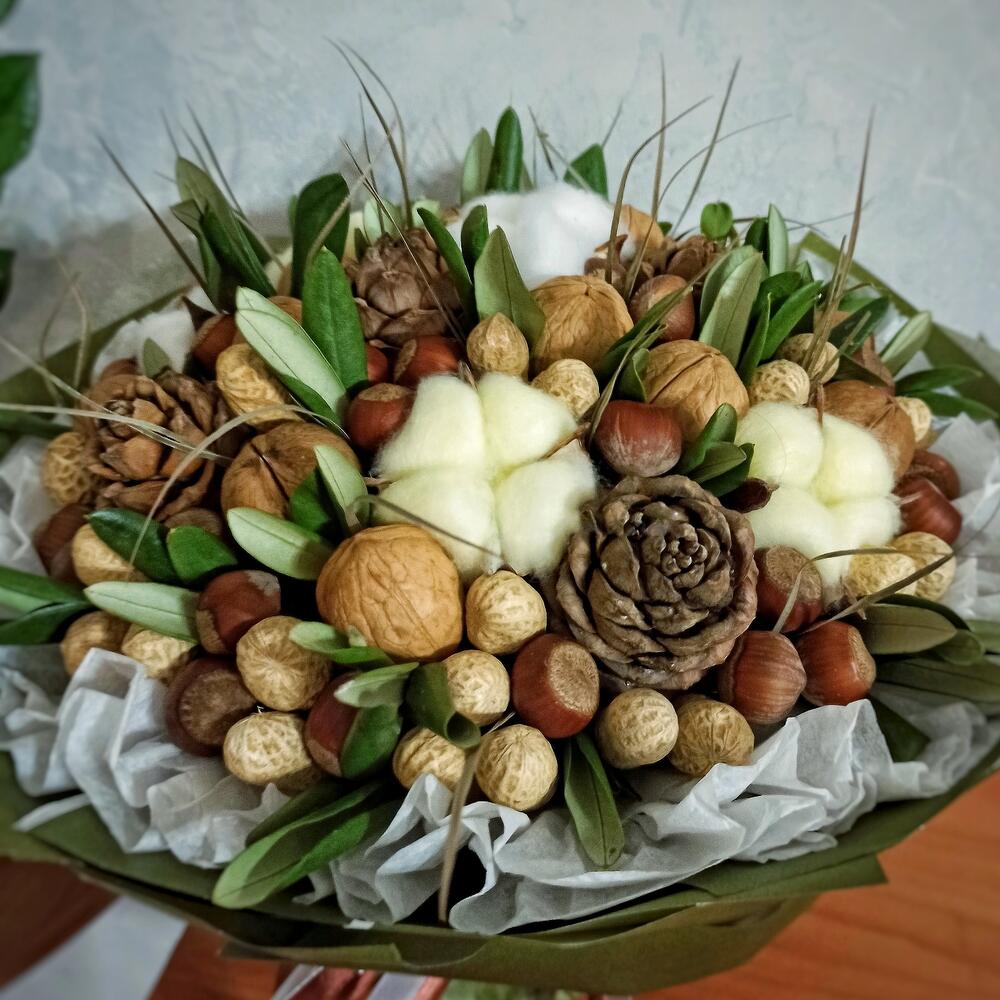 Хлопок искусственный – 5 шт.арахис в скорлупе – 35 шт.фундук в скорлупе – 40 шт.грецкий орех в скорлупе – 13 шт.шишка кедровая с орешками – 5 шт.олива (зелень) – 1 шт.робелини (зелень) – 1 шт.