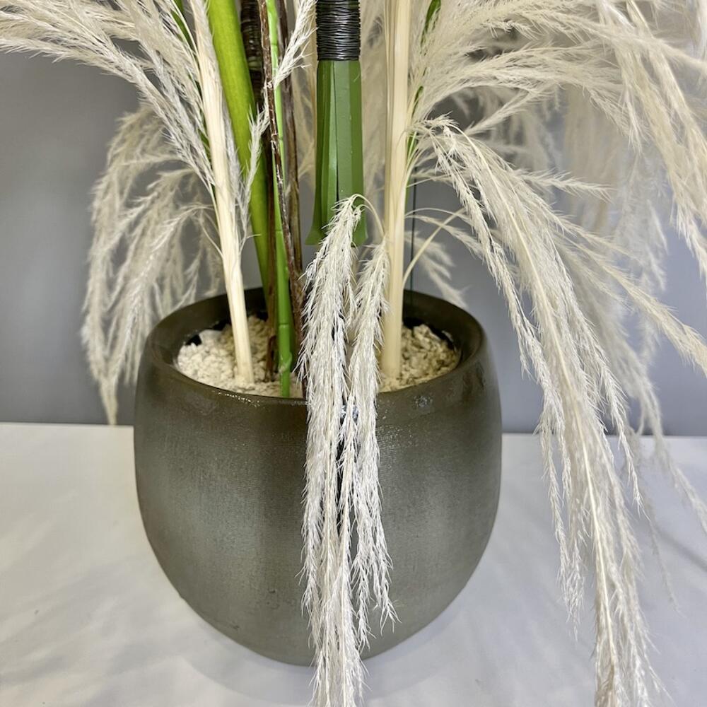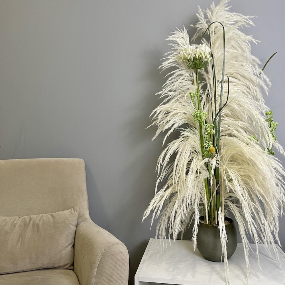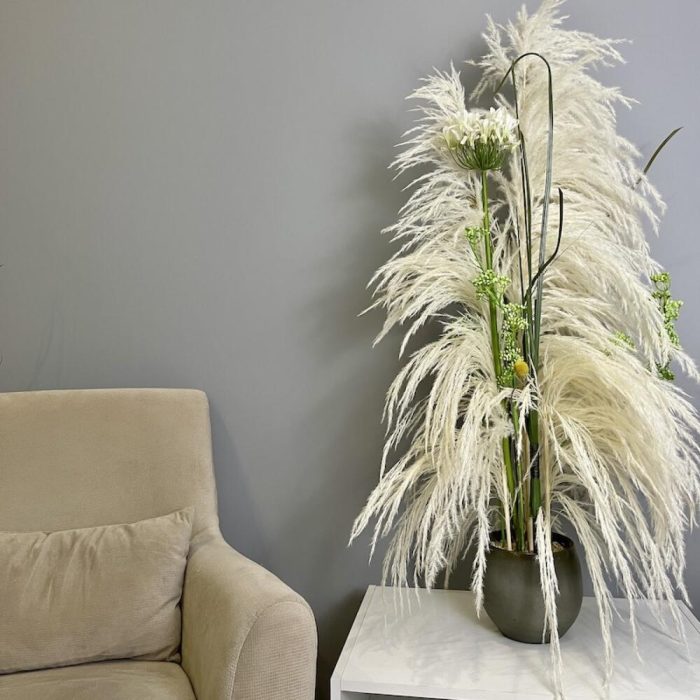 картадерия – 2 шт.агапантус искусственный – 1 шт.искусственные ветка – 2 шт.осока искусственная – 5 шт.Краспедия – 3 шт.Кашпо керамика – 1 шт.