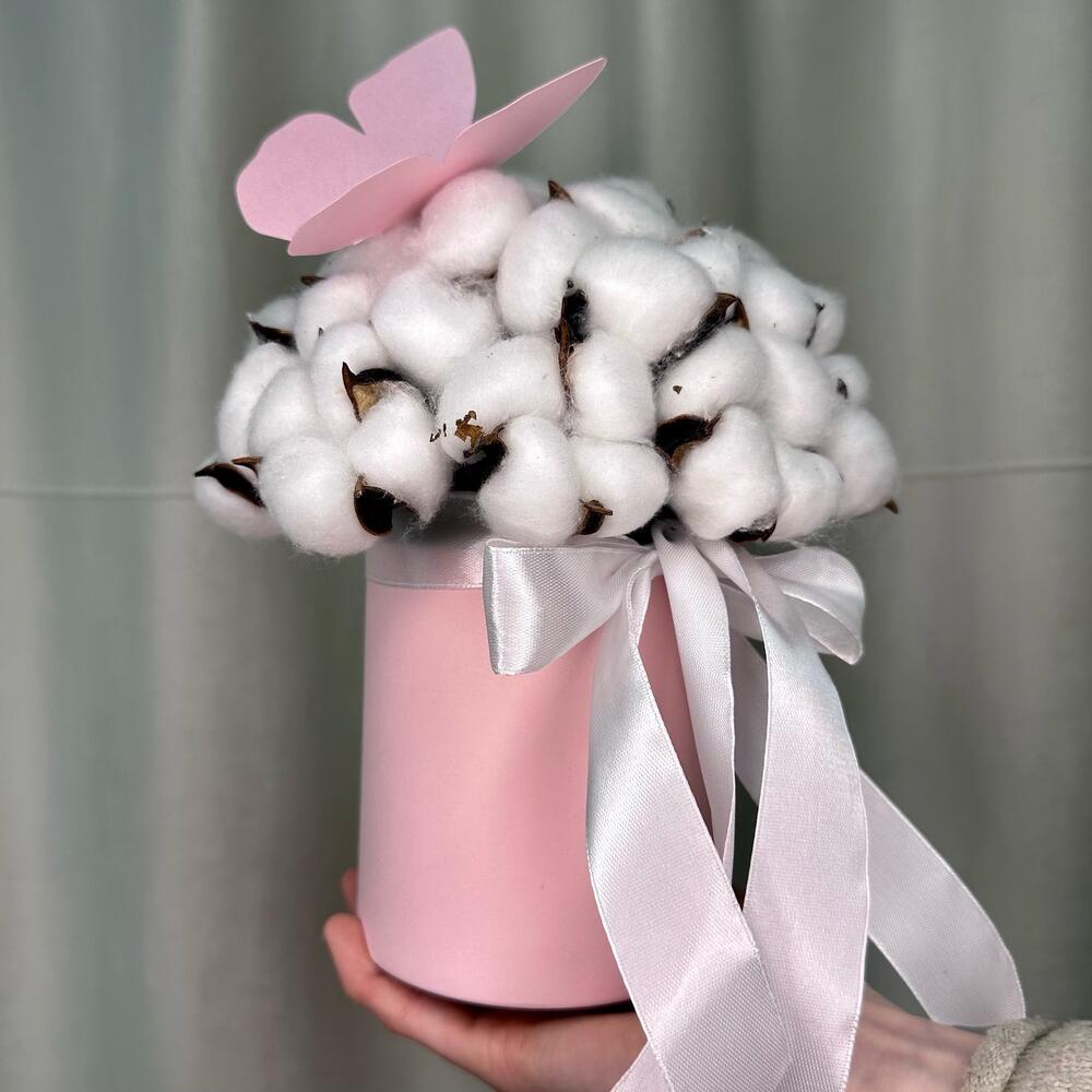 Хлопок натуральный – 15 шт.Шляпная коробка – 1 шт.Лента атласная – 1 шт.Открыточка с вашими пожеланиями – 1 шт.