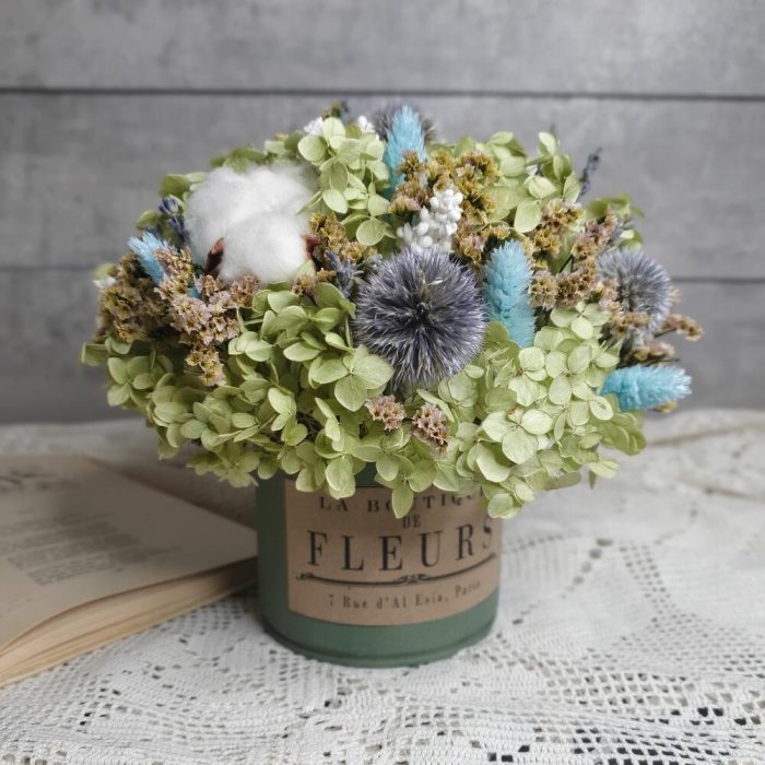 Эхинопс – 5 шт.гортензия сухоцвет – 1 шт.Фаларис – 7 шт.Хлопок натуральный – 3 шт.сорго пучок – 1 шт.стабилизированная статица пучок – 1 шт.лавандин пучок – 1 шт.Кашпо металлическое – 1 шт.