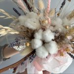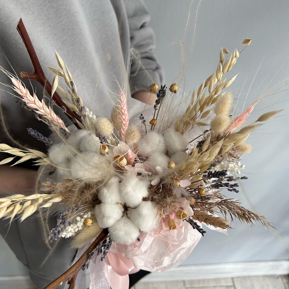 Хлопок натуральный – 3 шт.гортензия стабилизированная пучок – 2 шт.Лаванда (сухоцвет) – 25 шт.лен сухоцвет – 1 шт.овес сухоцвет – 6 шт.Лагурус – 8 шт.Пшеница – 4 шт.сорго – 3 шт.сухие цветы – 6 шт.Ковыль – 1 шт.Оазис флористический – 1 шт.Коробка шляпная – 1 шт.перья декоративные – 4 шт.