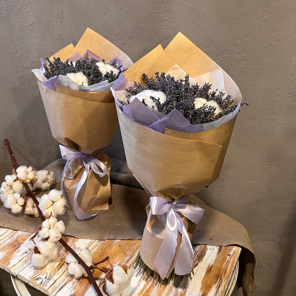 лаванда банч сухоцвет – 1 шт.Хлопок натуральный – 3 шт.Упаковка дизайнерская – 1 шт.