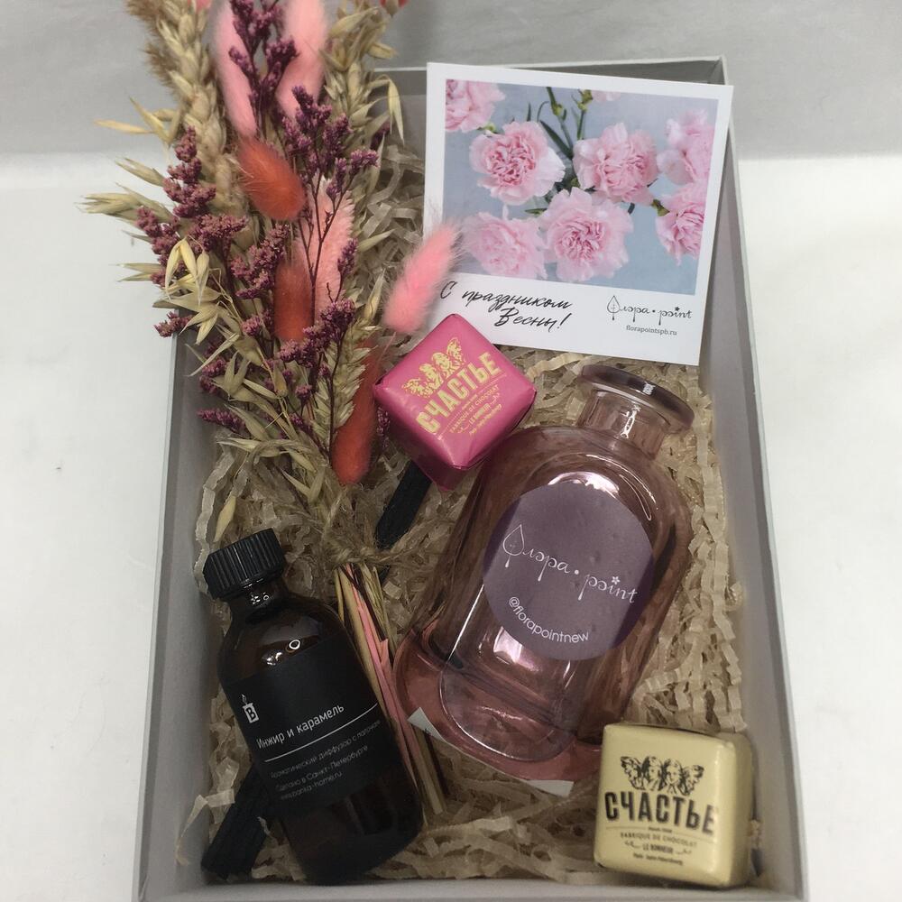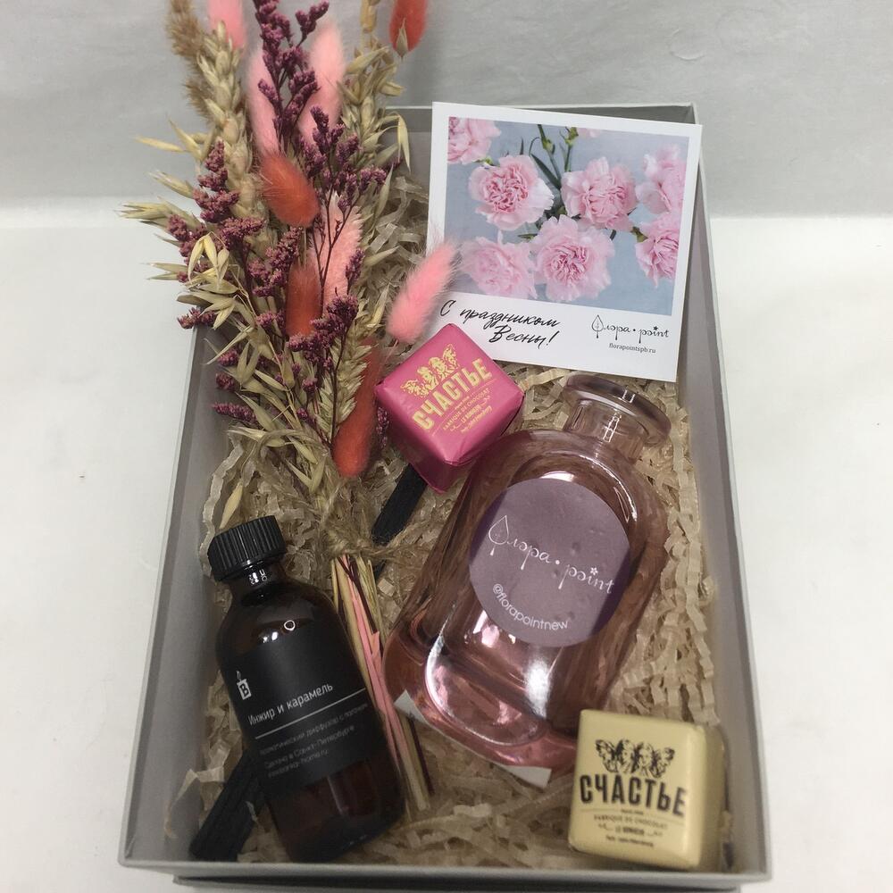 аромадиффузор для дома – 1 шт.конфета счастье – 2 шт.Ваза стекло – 1 шт.букет сухоцветов – 1 шт.Открытка – 1 шт.Подарочная коробка – 1 шт.Лента – 1 шт.