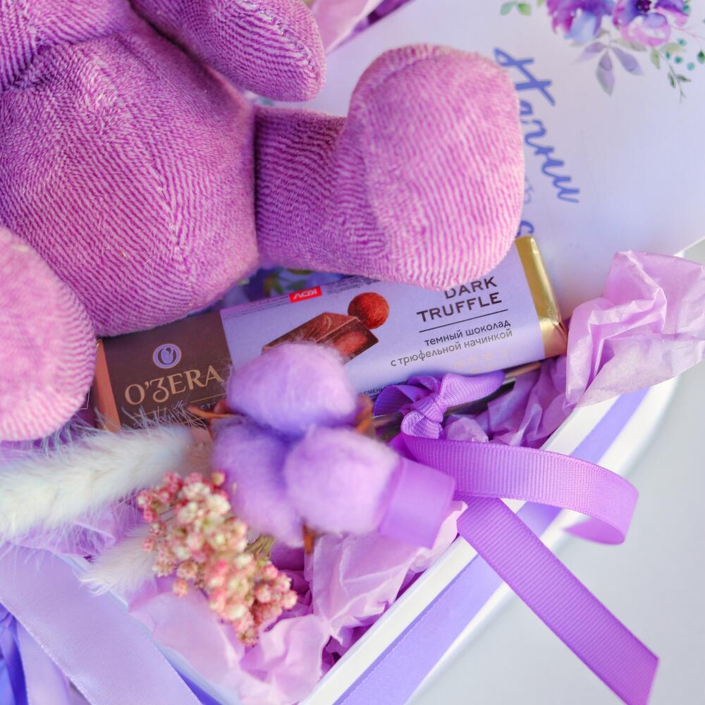 Прекрасный подарочный набор в синревых оттенках с мишкой, шоколадкой, букетом сухоцветов и открыткой не оставить равнодушной ни одну получательницу❤️К подарочному набору по Вашему пожеланию мы будем рады добавить конфеты, свечи, цветы и б/а вино.
