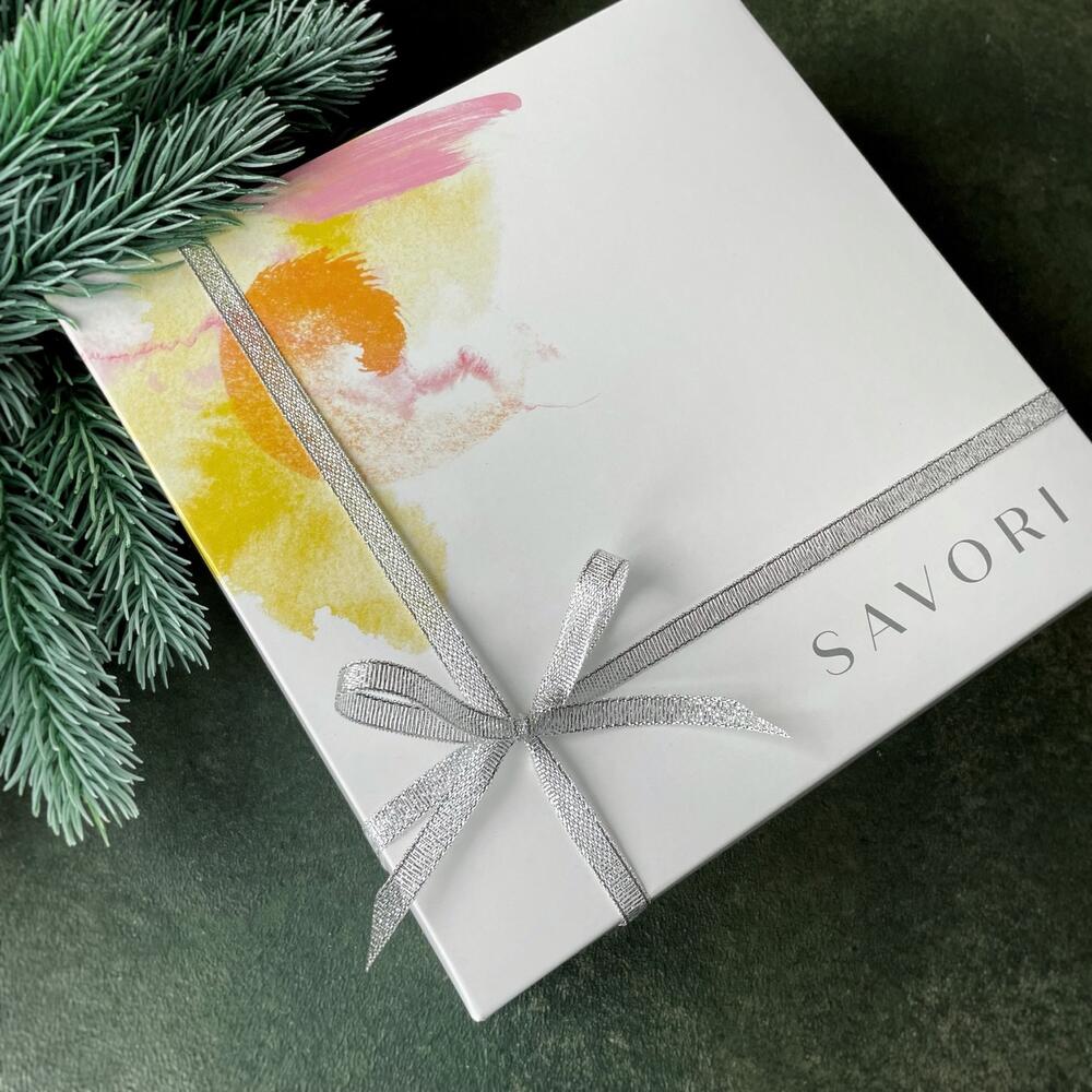 Подарочный набор SAVORI из чая eco-line и полезных сладостей подойдёт к любому приятному поводу!Слева ароматный чай: • чёрный чай c можжевельником, мятой, клубникой • нежный зелёный чай с цветами жасмина. Справа: сладкие лакомства – шоколадные батончики с начинкой и миндаль в меду. В коробочке два шоколадных батончика “Солёная карамель и арахис” by Lubaica. В их основе какао тертое, арахис, кокосовый сахар, сироп топинамбура, какао масло, кешью паста, гималайская соль. В середине букетик сухоцветов, сохраняет свою красоту не менее года. ***Ручная работа*** Поэтому в каждом подарке он может слегка отличаться внешне от представленного на фото, состав идентичный. Всё милое и ароматное кладём в нашу фирменную коробку SAVORI, завязываем бант серебристой лентой.