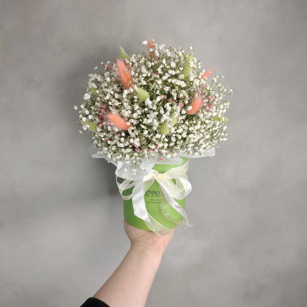 Коробка шляпная – 1 шт.Оазис флористический – 1 шт.Гипсофила – 7 шт.лагурус салатовый – 10 шт.лагурус персиковый – 7 шт.