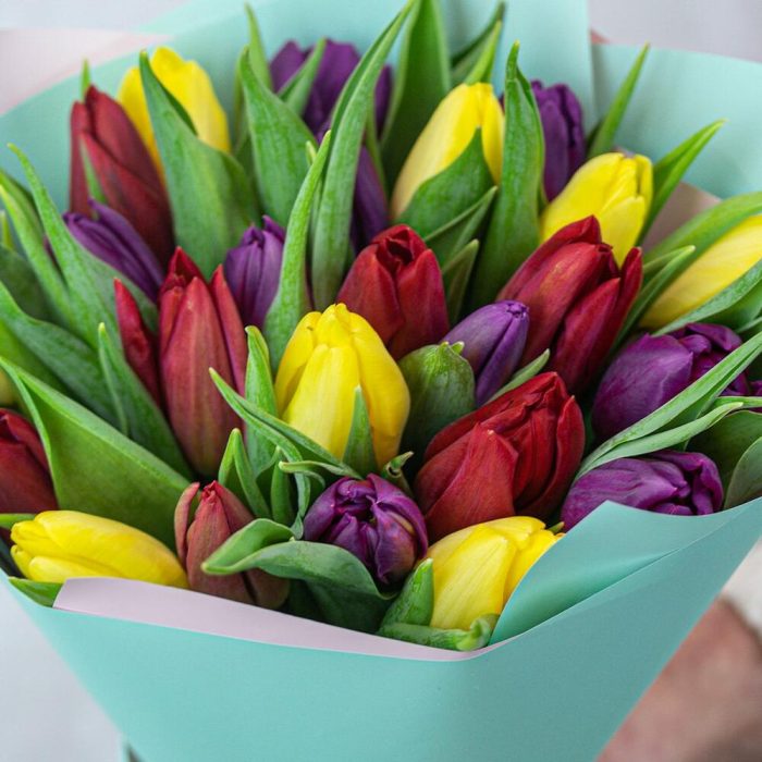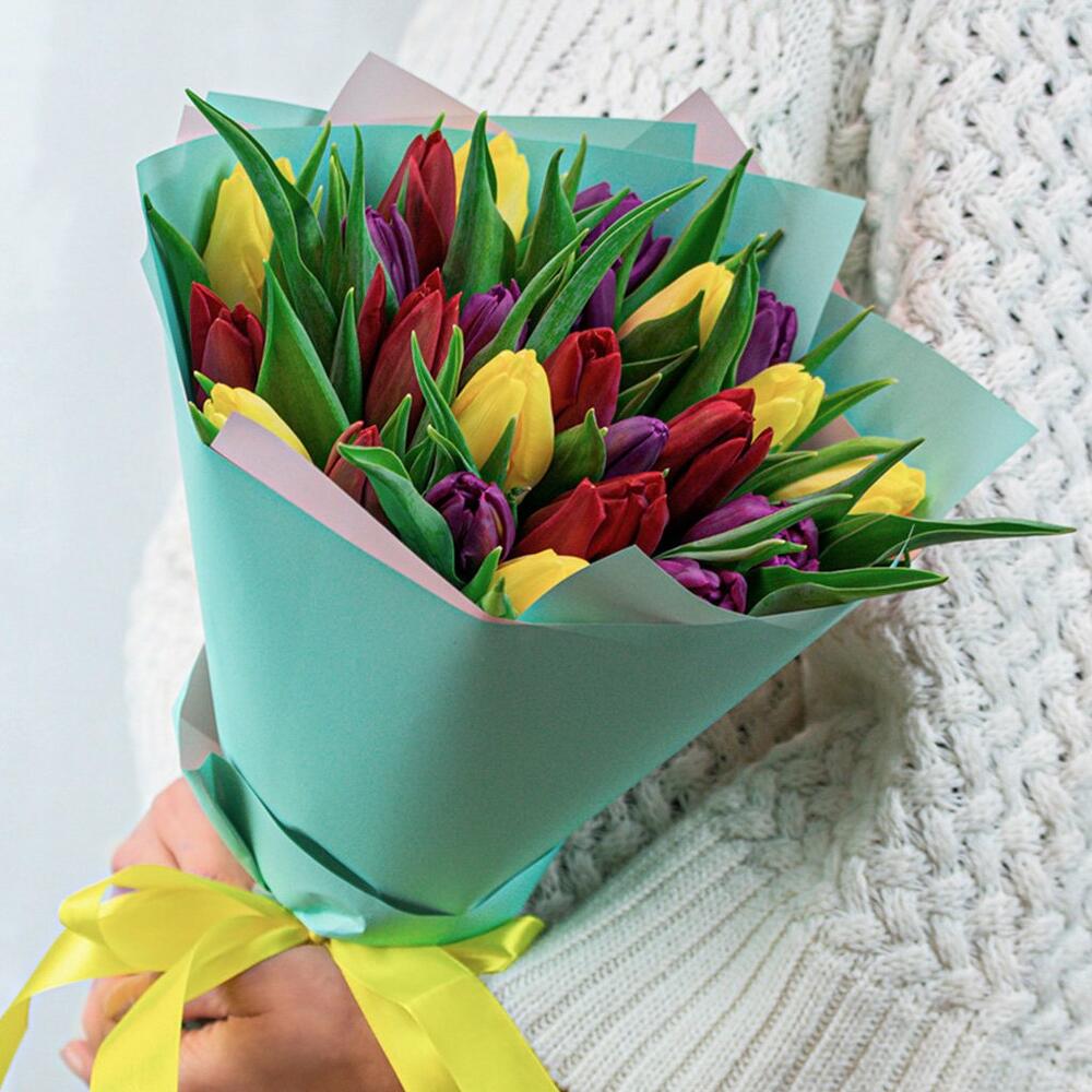 Букет из 25 тюльпанов стандарт яркий микс в упаковке