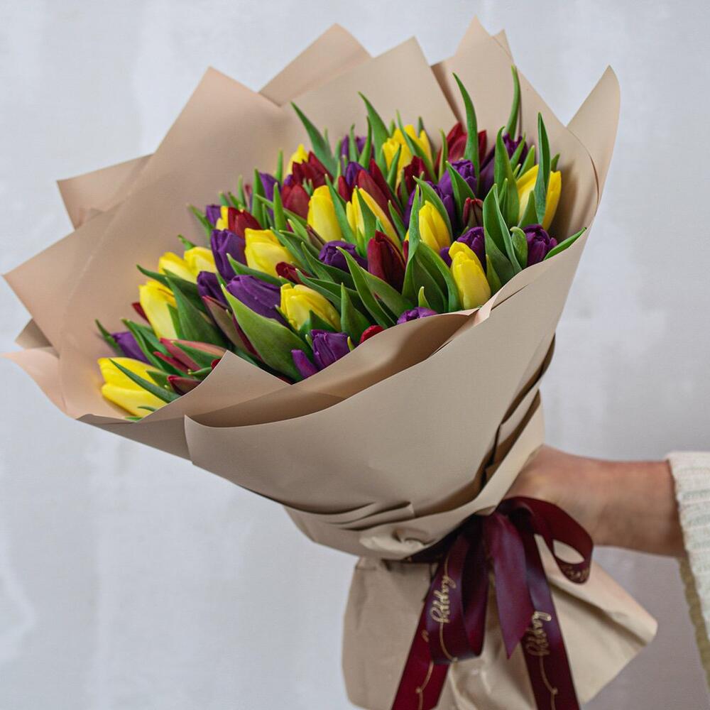 Букет из 51 тюльпана стандарт яркий микс в упаковке