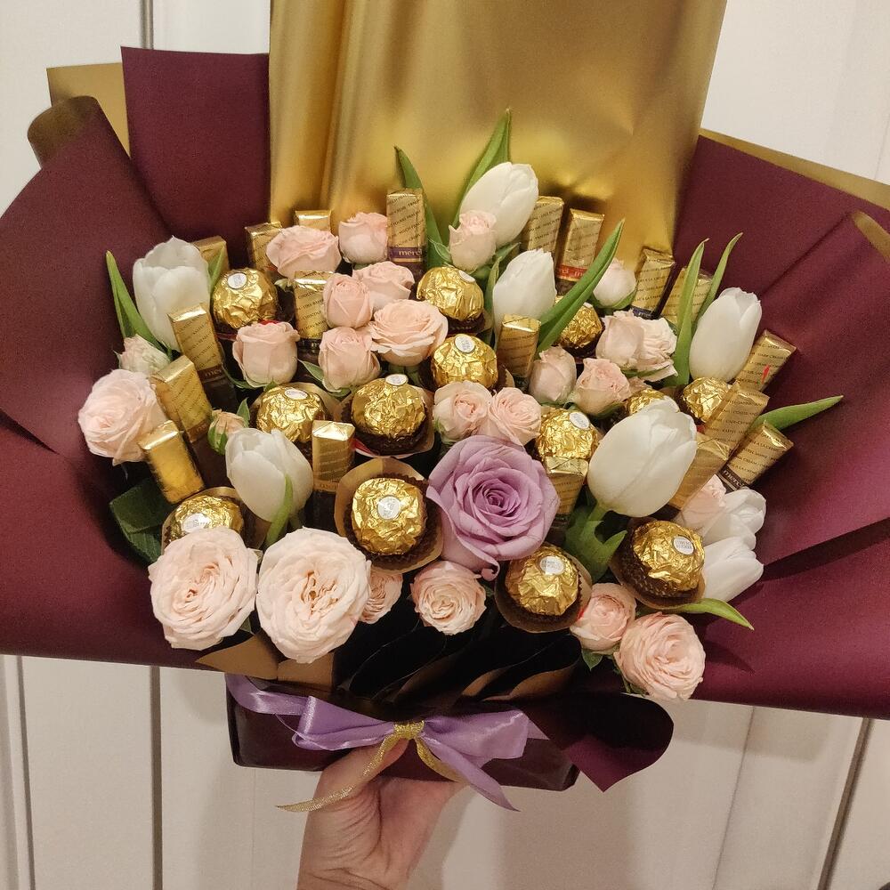 Конфеты Мерси – 250 гр.Дизайнерская упаковка – 1 шт.тюльпаны белые – 7 шт.розы кустовые – 7 шт.конфеты фероро роше – 14 шт.