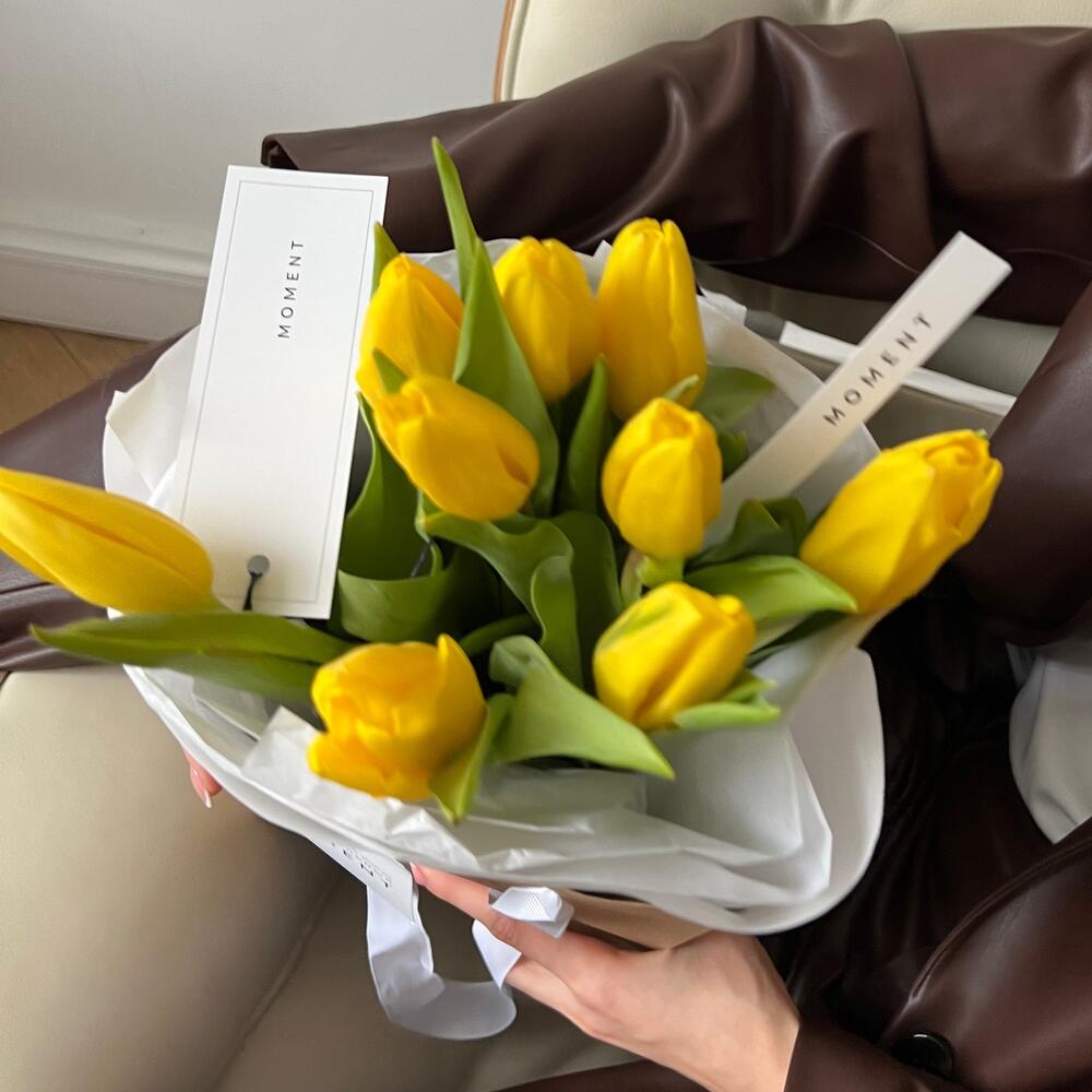 Крафт – 1 шт.Карточка для подписи – 1 шт.тюльпаны желтые – 9 шт.мягкий крафтовый пакет – 1 шт.