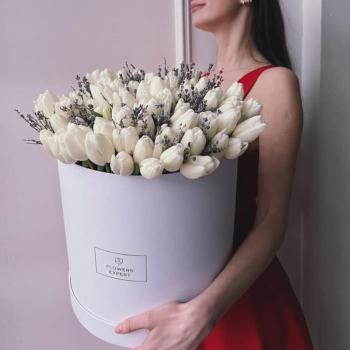 Тюльпан белый – 101 шт.Лаванда – 1 шт.Коробка шляпная – 1 шт.