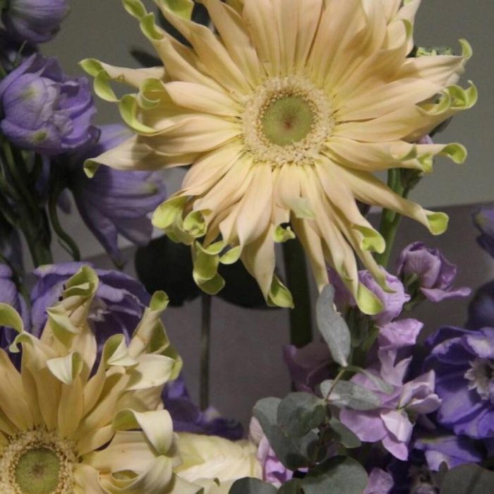 Дельфиниум – 2 шт.Тюльпан сортовой – 3 шт.Гербера – 3 шт.Ранункулюс – 1 шт.Маттиола – 4 шт.кизильник – 2 шт.кукушкины слезы – 2 шт.Эвкалипт – 5 шт.Упаковка – 1 шт.